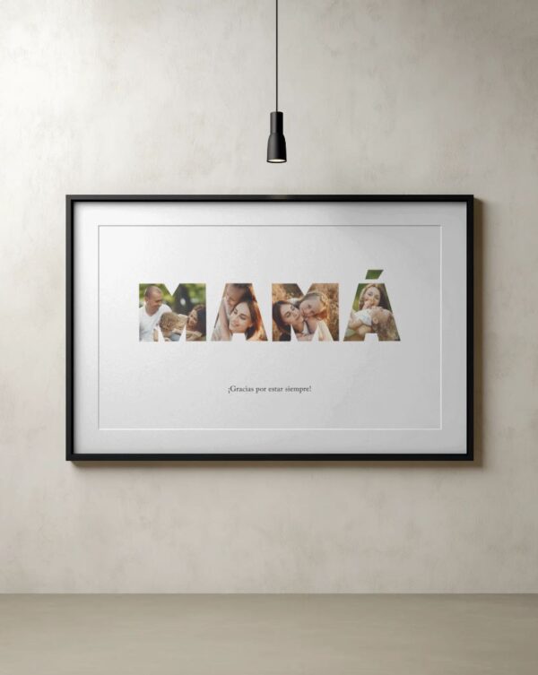 Lámina con palabra formada por fotos: Un detalle único y lleno de emoción que convierte tus recuerdos en una pieza especial. Cada letra de la palabra “mamá” está compuesta por tus propias imágenes, creando un collage con un gran valor sentimental.